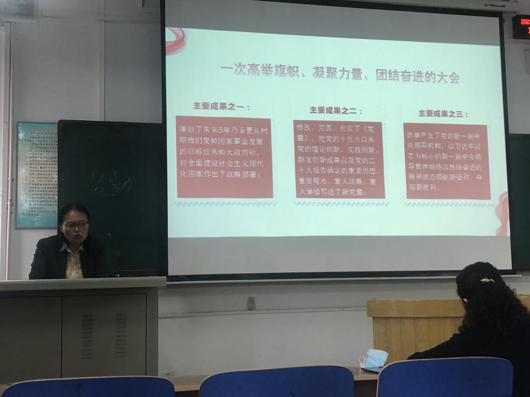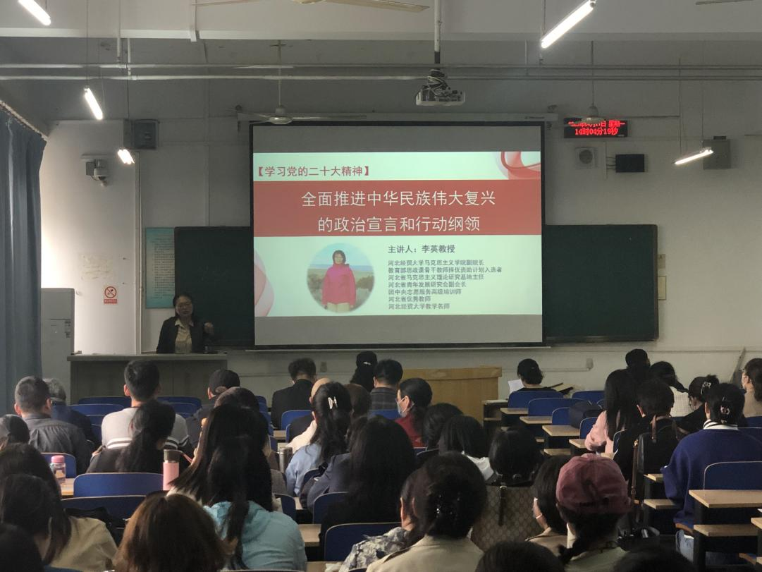 2023年4月17日, suncitygroup太阳集团邀请马克思主义公司副经理李英教授进行党的二十大精神宣讲,讲座题目是:全面推进中华民族伟大复兴的政治宣言和行动纲领。讲座由suncitygroup太阳集团副经理杨清珍主持,suncitygroup太阳集团和外语部的全体教职工参加了讲座。