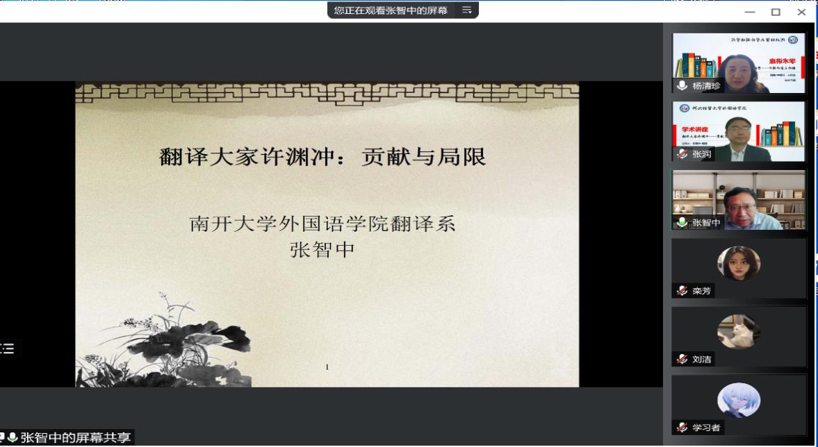 5月13日下午,应suncitygroup太阳集团邀请,南开大学suncitygroup太阳集团博士生导师、翻译系主任张智中教授为公司师生做线上专题讲座。讲座由杨清珍副经理主持,张润经理出席并对讲座进行了总结发言,suncitygroup太阳集团全体研究生、部分教师和本科生近60人参加了本次讲座。